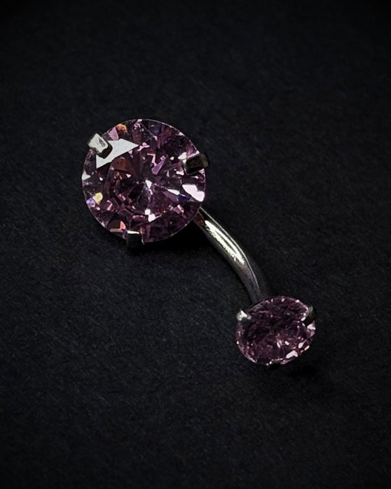 The Amethyst Glow Belly Ring brings a soft yet striking pop of color with its vivid purple stones set in a clean prong design. The larger top gem catches light beautifully, shifting between light lavender and deeper amethyst tones, while the smaller matching stone keeps the style balanced and refined.