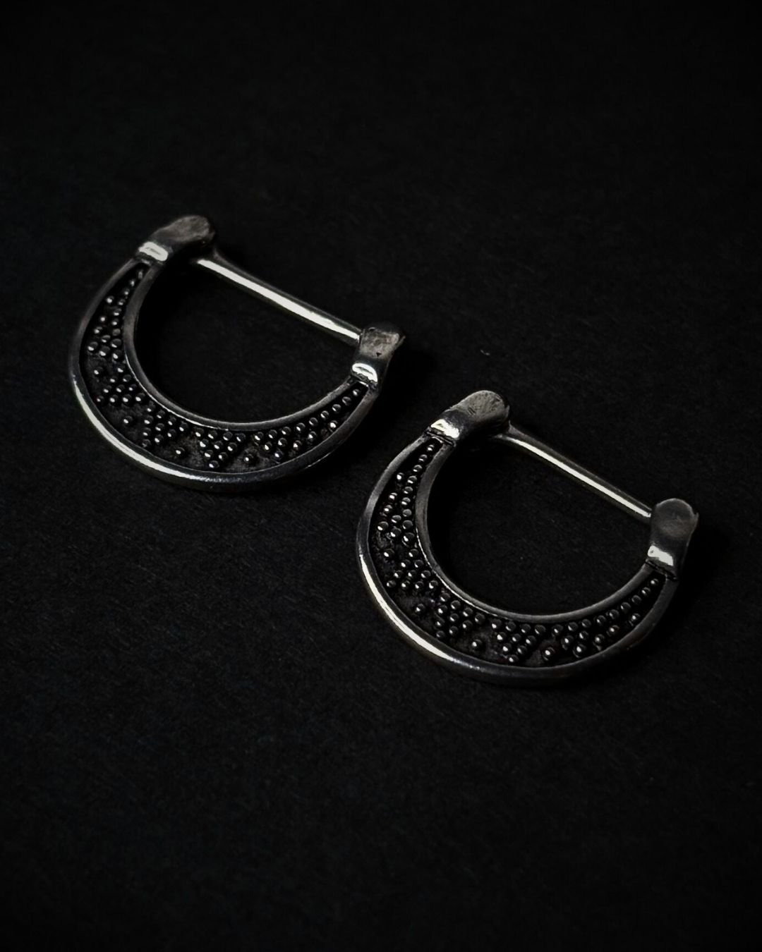 This barbell-style piece features a polished silver finish with a curved arc front detailed in fine bead texture, giving it a bold yet balanced look. The structured shape adds character while keeping the design clean and wearable.