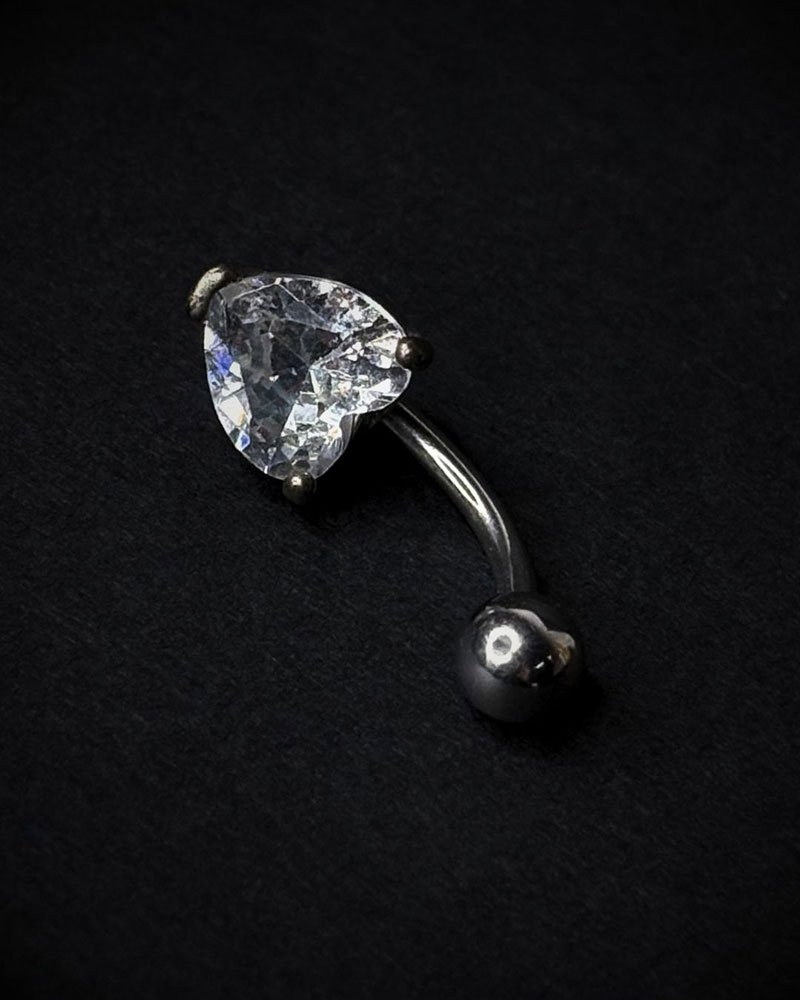 The Crystal Heart Belly Ring brings a bright, clean sparkle with its clear heart-shaped stone set in a simple prong design. The gem catches light from every angle, giving off sharp flashes that make the piece stand out without feeling heavy or overly dramatic. A smooth metal ball anchors the bottom and keeps the overall look balanced and minimal.