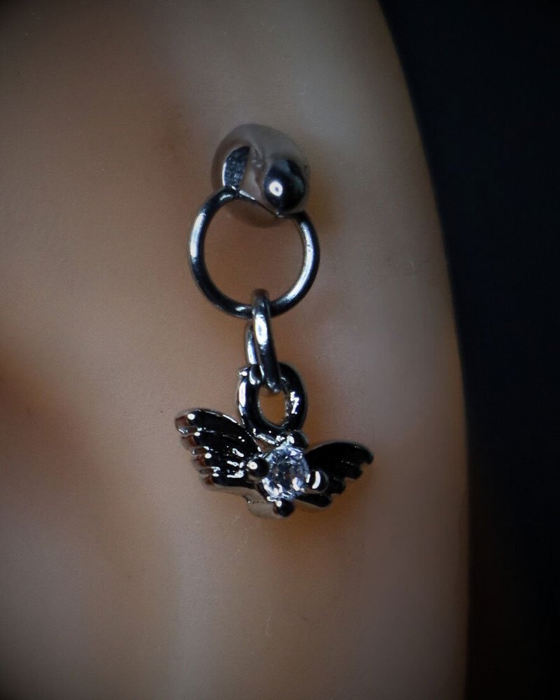 This drop stud features a small wing design with a clear crystal set at the center, creating a balanced look that feels detailed but not overpowering. The open wings add shape and movement, while the crystal catches light subtly as it hangs.