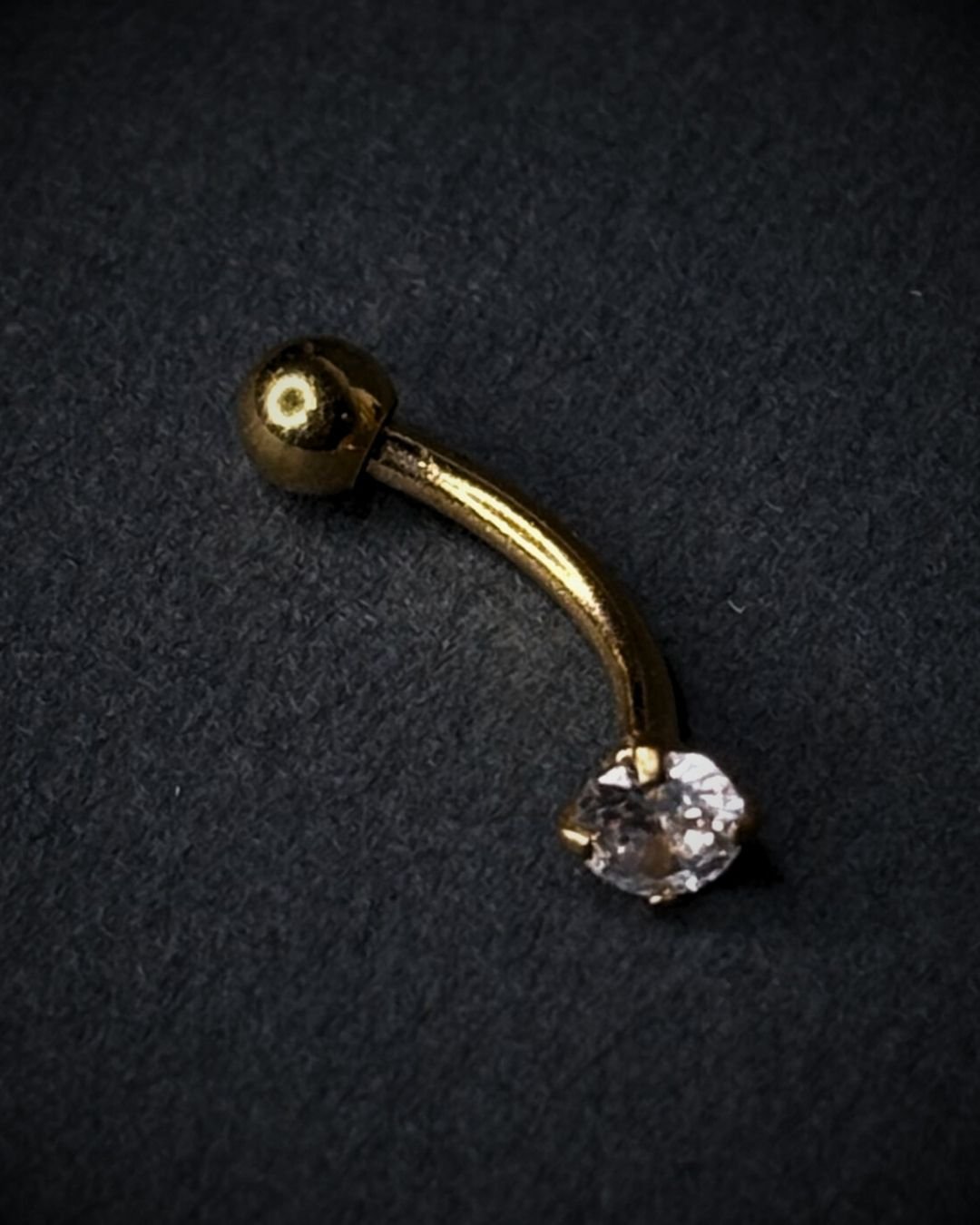 This curved barbell features a smooth, ergonomic shape with a polished finish, highlighted by a clear stone that adds a subtle shine. The clean design keeps the focus on the stone while maintaining a sleek and minimal look.
