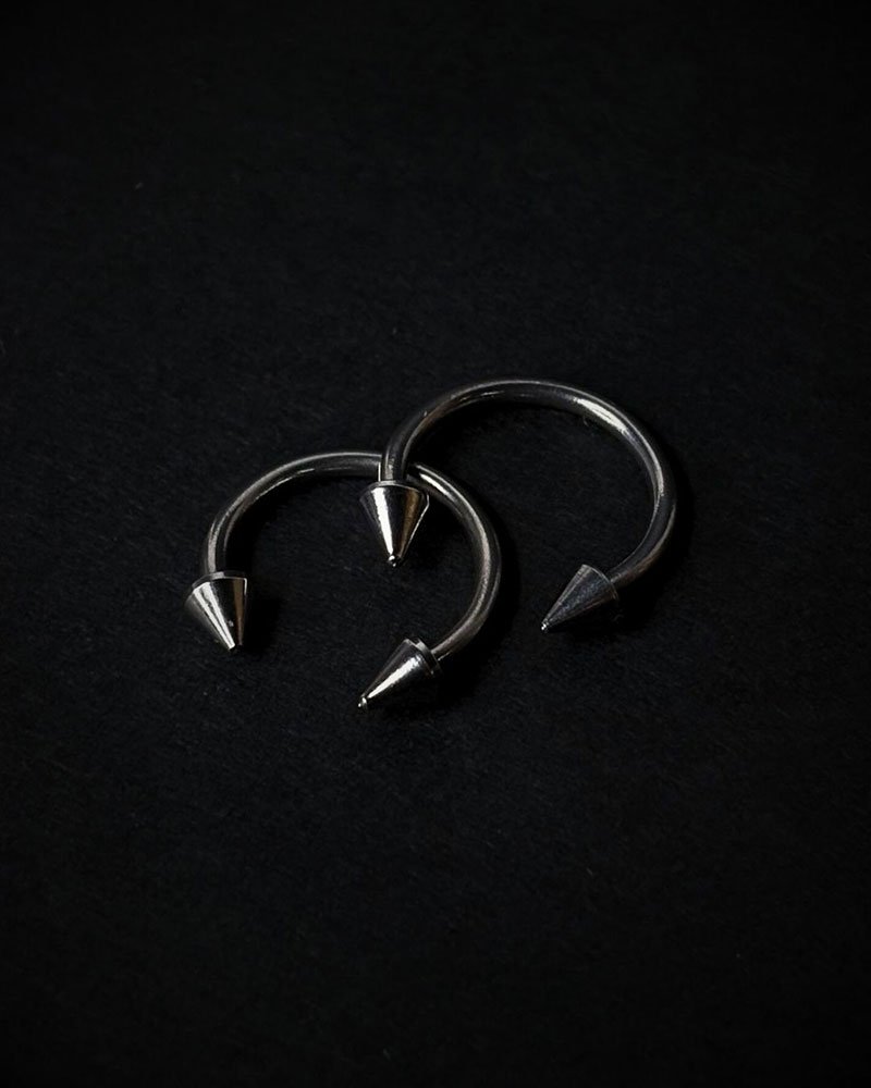 This horseshoe-style ring features a smooth curved bar finished with sharp spike ends, creating a bold and edgy look. The polished silver tone keeps the design clean while highlighting the pointed details for a strong visual impact.