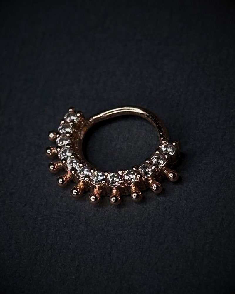 This clicker ring features a crown-style arc lined with bright stones and tiny bead accents that give it a sparkling, decorative edge. The smooth hinge makes it easy to wear while staying secure once closed. A stylish choice for everyday wear or special piercings. Common size.