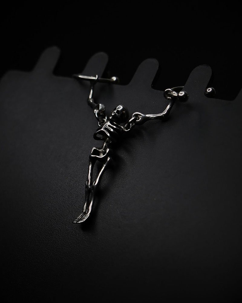 This industrial piercing features a bold skeleton figure design suspended between two straight bars, creating a striking and edgy look. The detailed skeleton adds strong character, making it a standout piece for those who like statement jewelry.