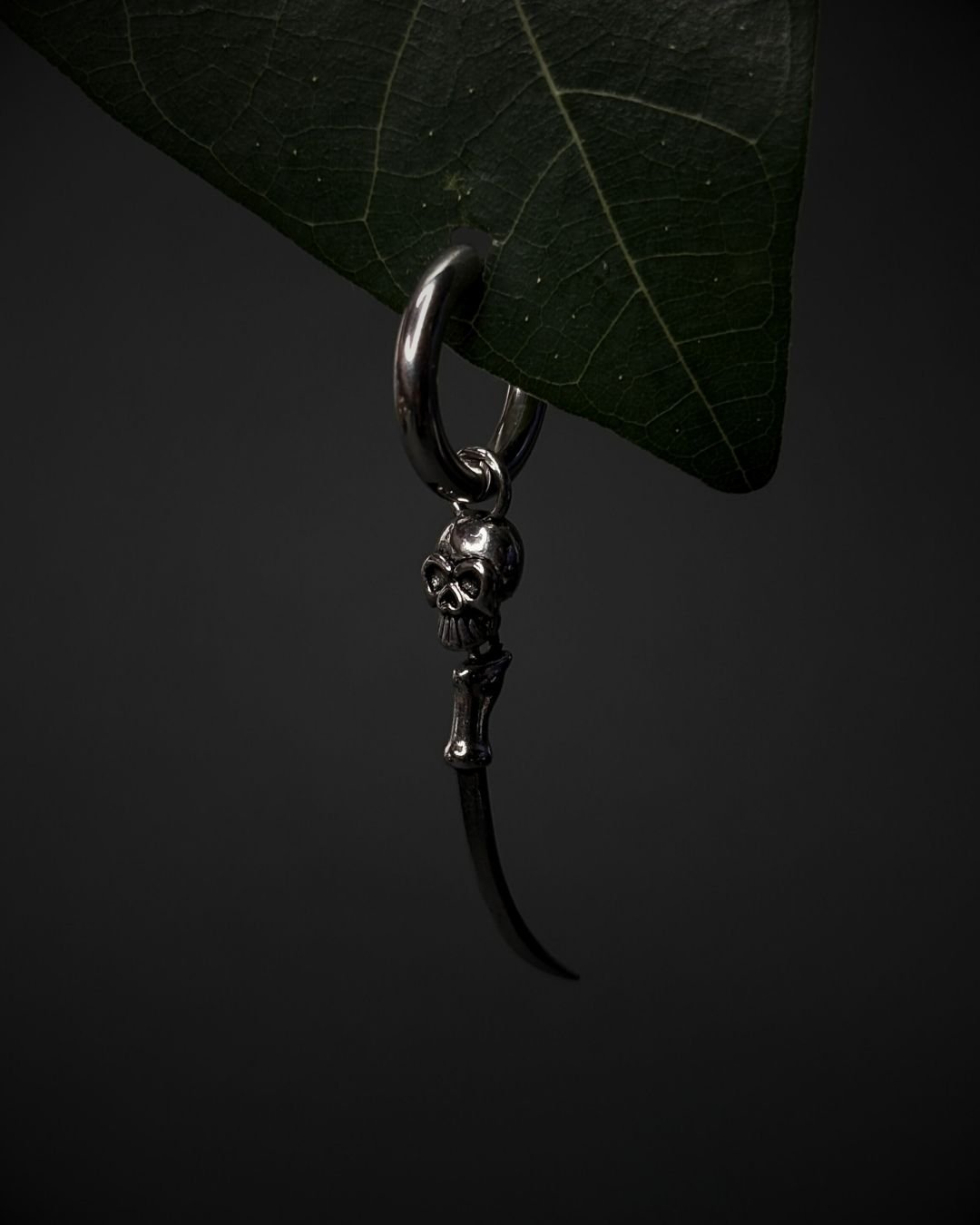 A bold silver hoop featuring a detailed skull accent with a curved fang drop for a dark, edgy look. The sculpted skull adds character, while the fang creates a sharp silhouette that stands out without feeling heavy. Finished in polished silver for a clean but rebellious style.
