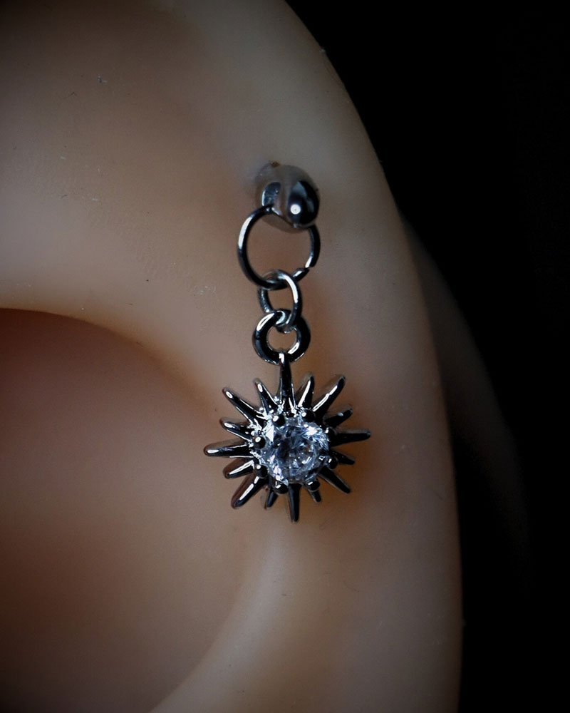 This drop stud features a radiant sunburst design with a clear, round crystal set at the center and sharp metal rays extending outward. The dark polished finish creates strong contrast, giving the piece a bold, edgy look while still keeping a refined sparkle.
