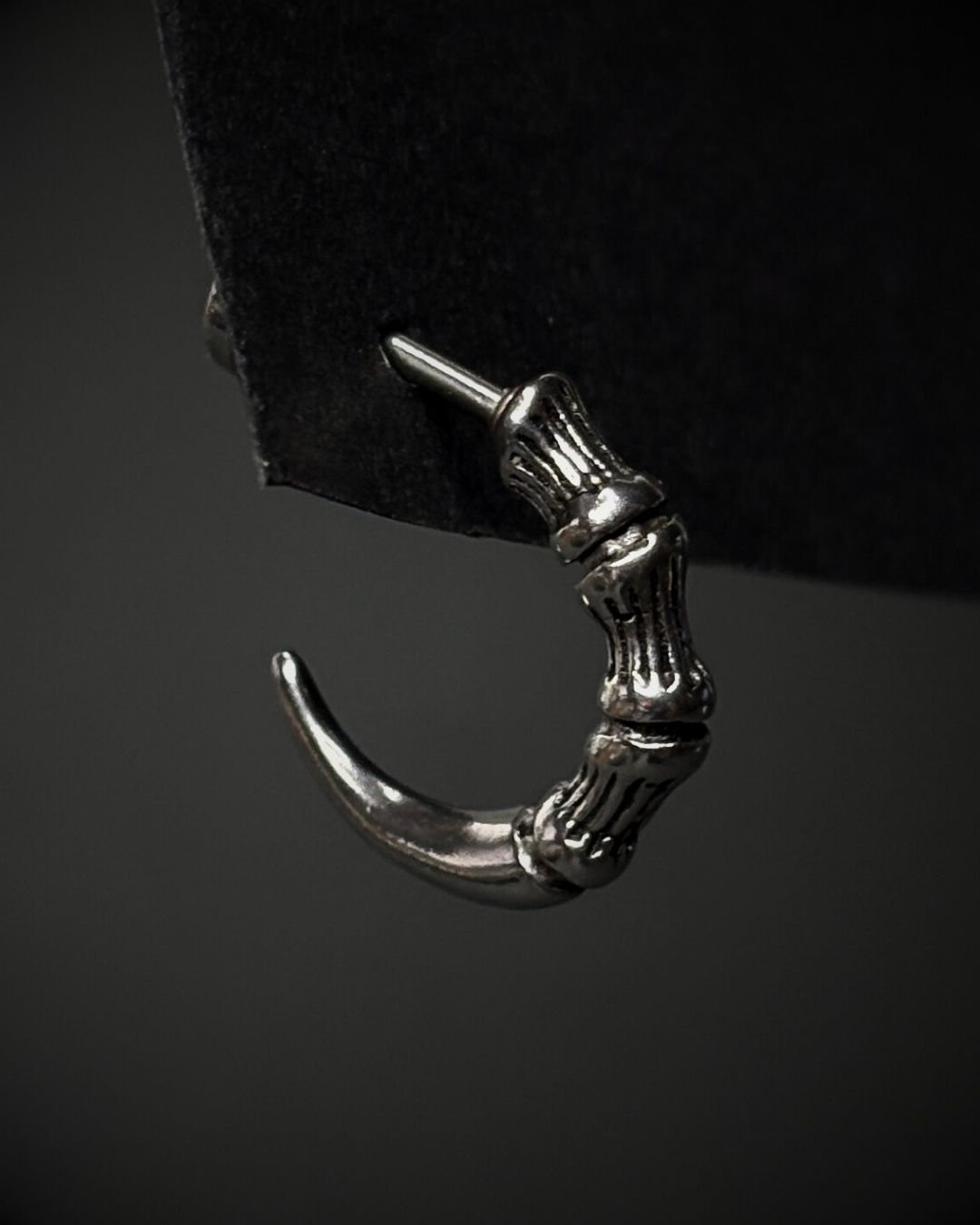 This curved silver hook features a bold tribal-inspired design with carved segment detailing along the arc. The sculpted texture gives it a raw, statement look while the smooth curve ensures a comfortable fit.